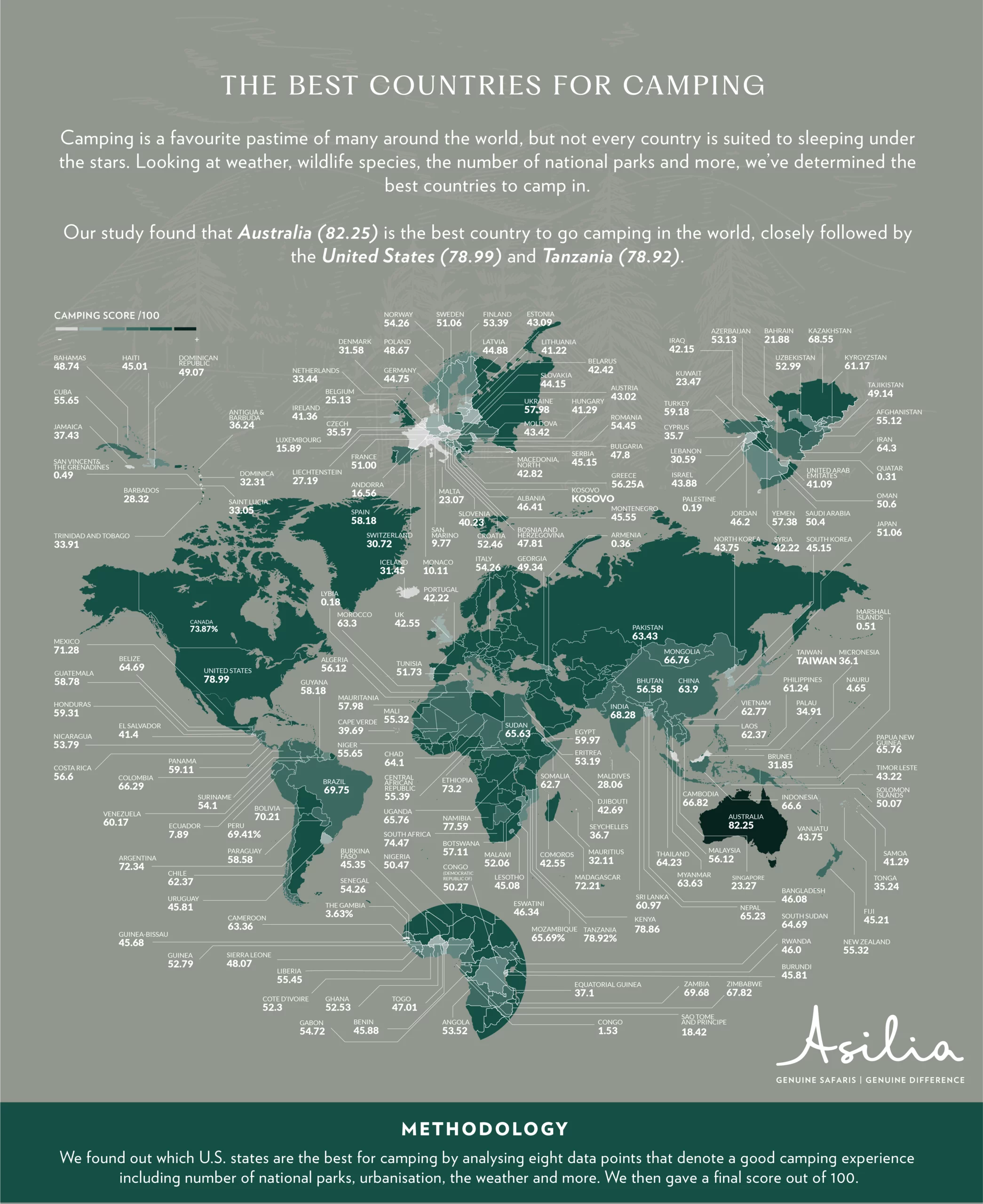 To conduct the study, Asilia first pulled a seed list of all the countries and U.S. states around the world. We then analysed each location based on eight different data metrics which denote a good place for camping: wildlife and plant species diversity, light pollution levels, annual rainfall, number of national parks, urbanisation rates, availability of outdoor activities, and population density.