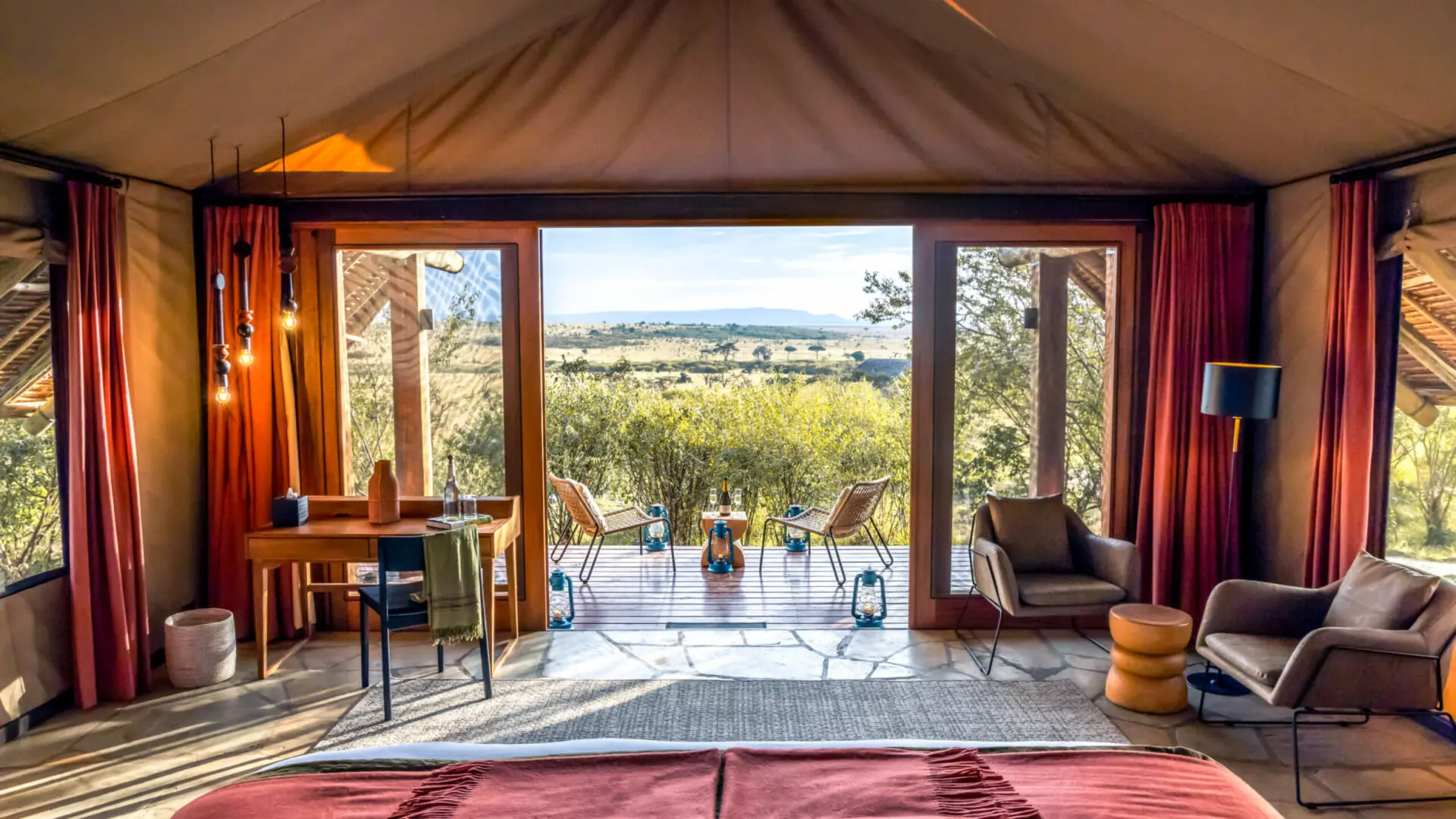 Naboisho Camp is designed to provide a spacious and airy atmosphere. It features nine stylish tents with king-sized or twin beds, indoor and outdoor hot-water showers. The tents are cleverly conceived to offer stunning views of the Naboisho plains, even from the outdoor shower. Each tent has a daybed on which to relax between game drives or choose to enjoy the views from the comfortable main lounge and swimming pool. The private veranda in front of your tent is perfect for secluded romantic sundowners or an early morning coffee.